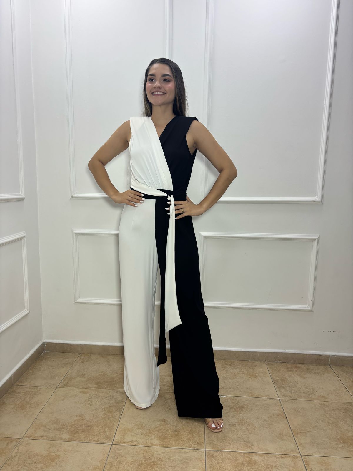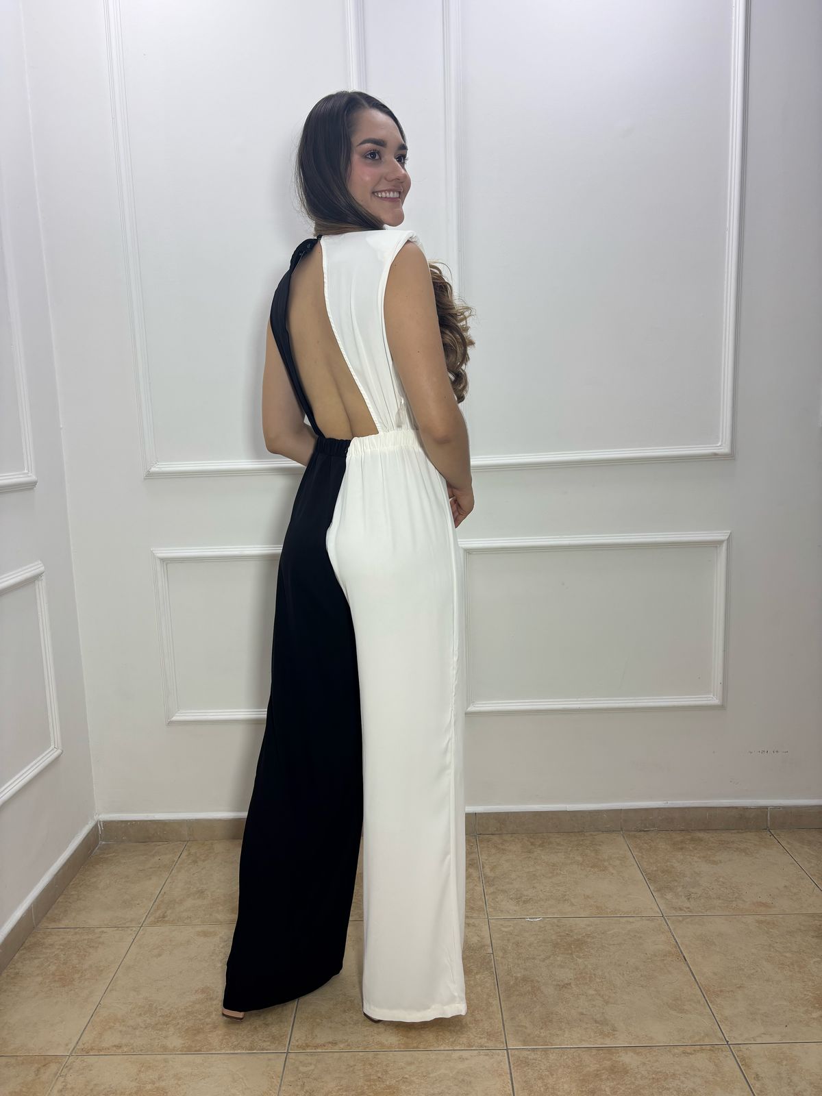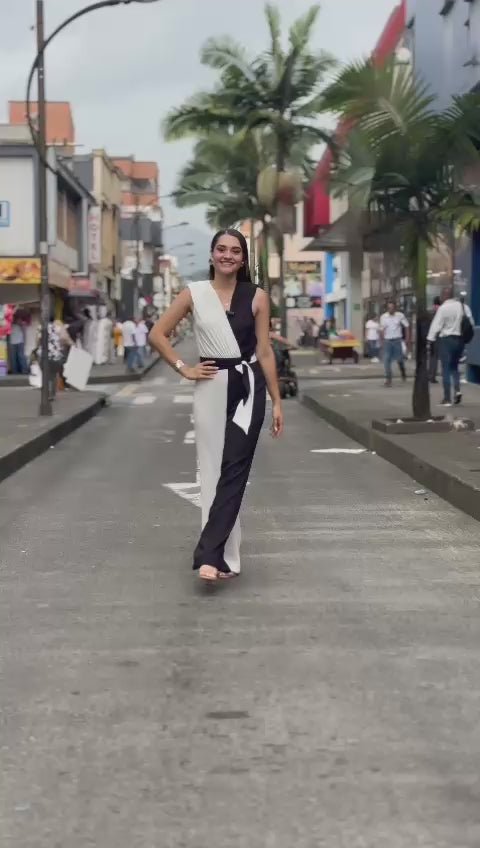 Enterizo medio luto, mitad blanco, mitad negro. Tela fresca, comoda y elegante