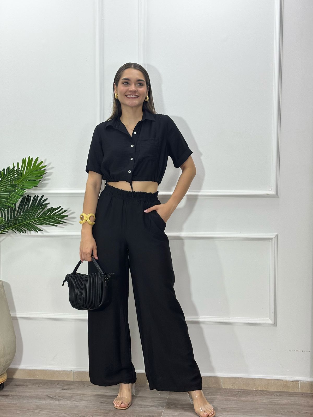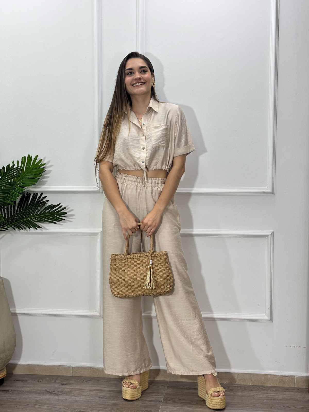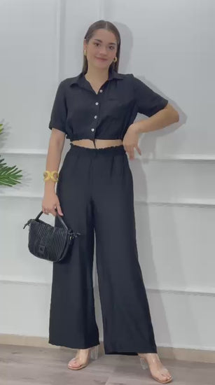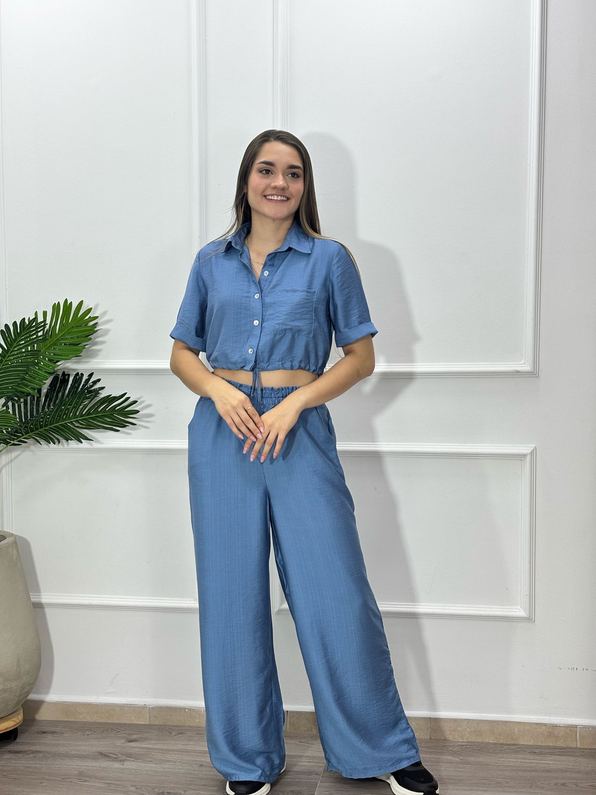 Set lino; blusa crop con elástico en cintura y pantalón con resorte, perfecto para amoldar y ajustar en cintura, super fresco y versátil.