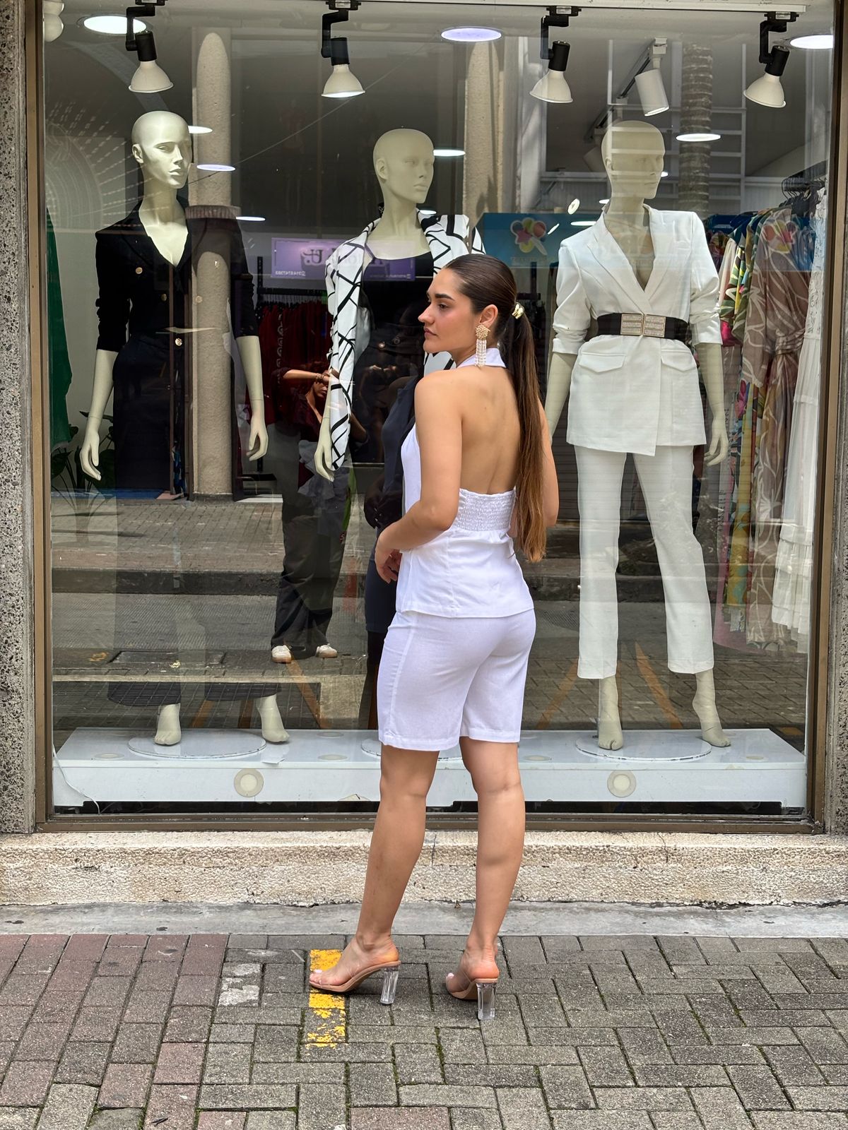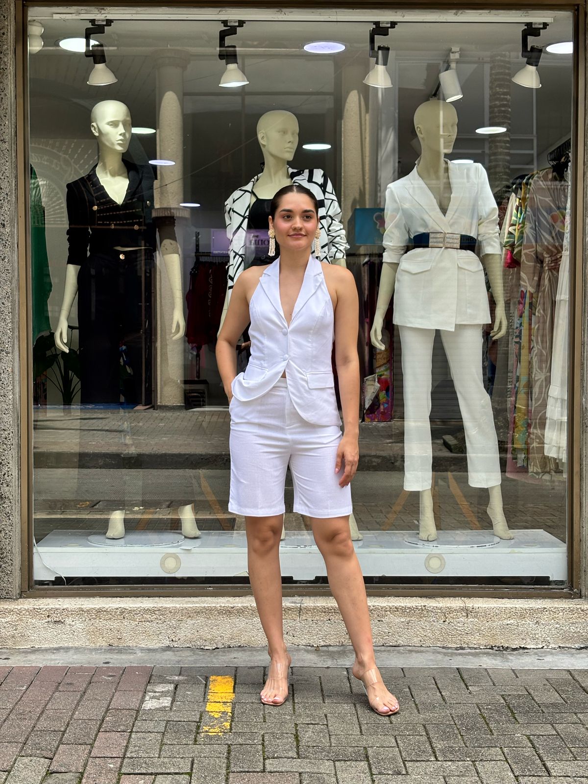 Set lino en color blanco, bermuda y blusa con cuello camisero.